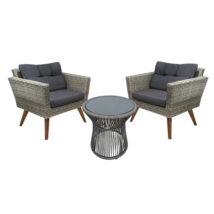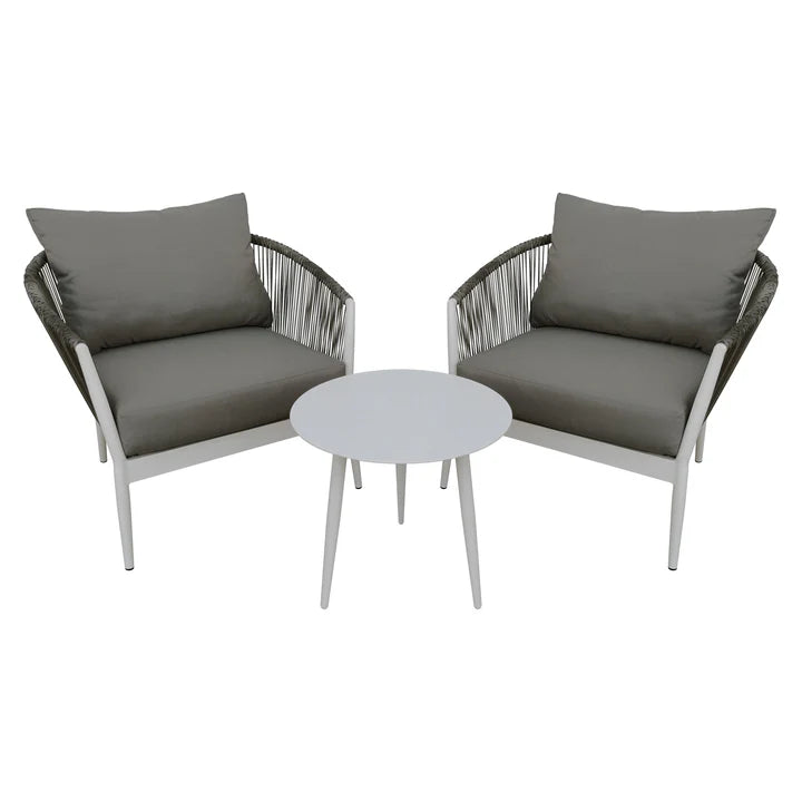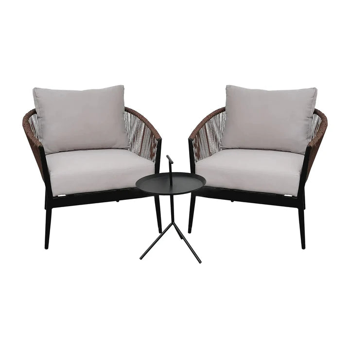 Set para uso interior y exterior, compuesto por 2 sillones y una mesa. Inyectado con fibra de vidrio y PP. Protección UV. Peso neto 16kg. Cojínes...