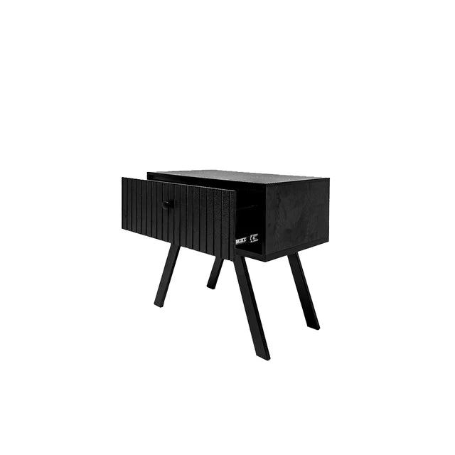 Mueble que se entrega armado. Buró look Japandi de 1 cajón con corredera de extensión. Estructura de MDF de 12mm y frente de melamina negra rauteada en 3D. Patas de metal desmontables. El producto viene armado menos las patas.