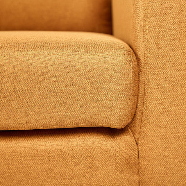 Estructura de madera de pino de primera, horneada y sin nudos, con conjuntos reforzados en esquinas y con cargadores adicionales. El conjunto impide la fatiga de la estructura evitando que el mueble se rechine o incluso se pueda llegar a fracturar. El acojinamiento es de hule espuma que excede los 30kg de densidad, siendo 24kg el estándar recomendado. Las patas de acero cromado. Está tapizado con poliéster de hilo cerrado con respaldo de algodón, lavable. Extremadamente duradero.